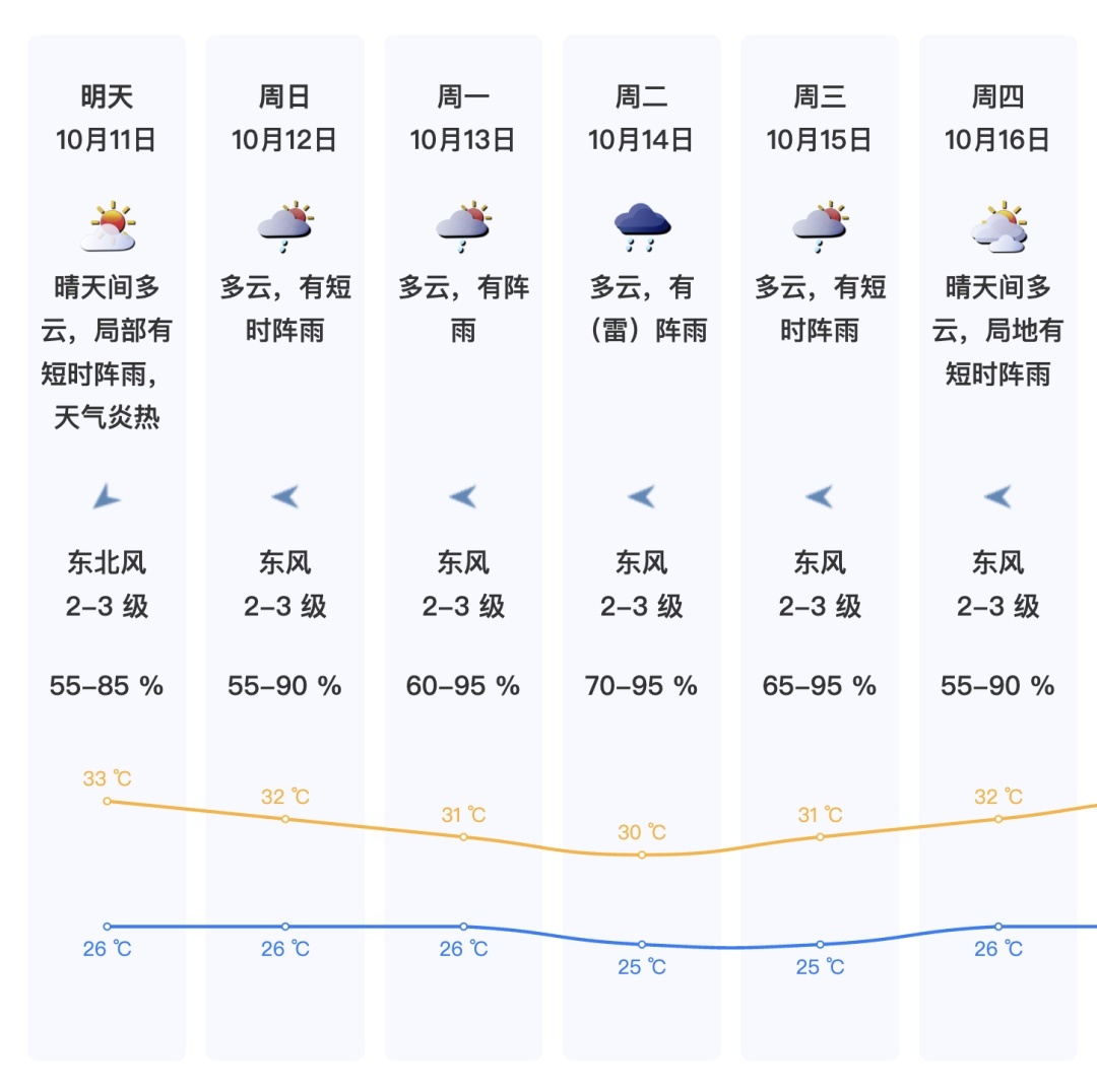 •10月11日晴天间多云,局部有短时阵雨,天气炎热;
